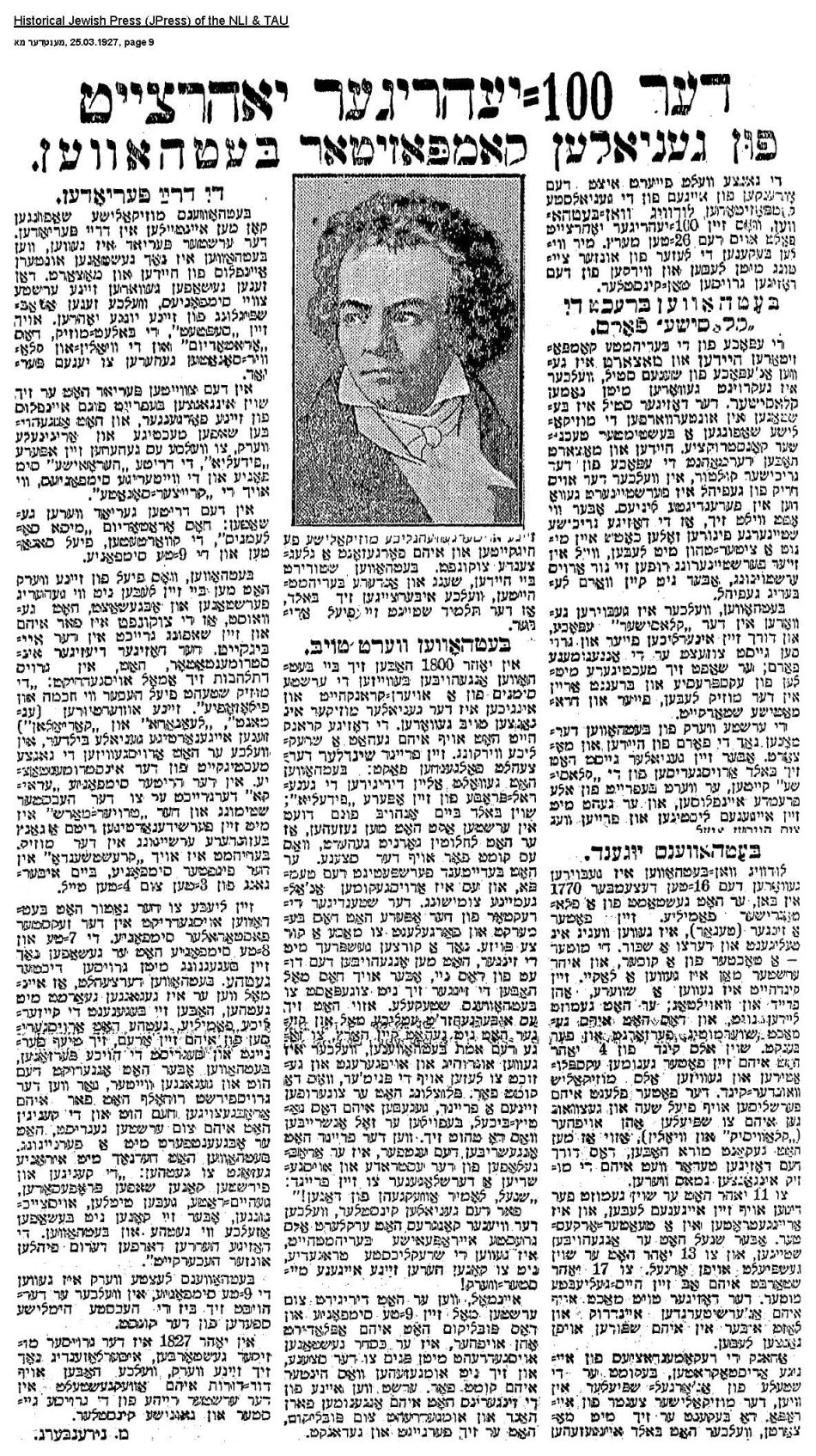 This invitation gave us at YIVO a wonderful opportunity to explore the Beethoven-related materials in our own collections. We have Yiddish translations and adaptations of Ode to Joy and other vocal works. We have beautifully illustrated Yiddish children’s books about Beethoven. We have Yiddish poetry about Beethoven. We have novels, travelogues, newspaper stories, even academic books about Beethoven – in Yiddish.