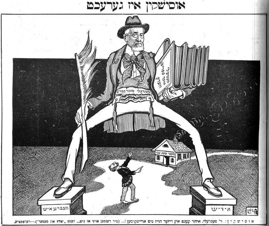 Zionist ideologue Menakhem Usishkin blocks Mendele (who straddles the