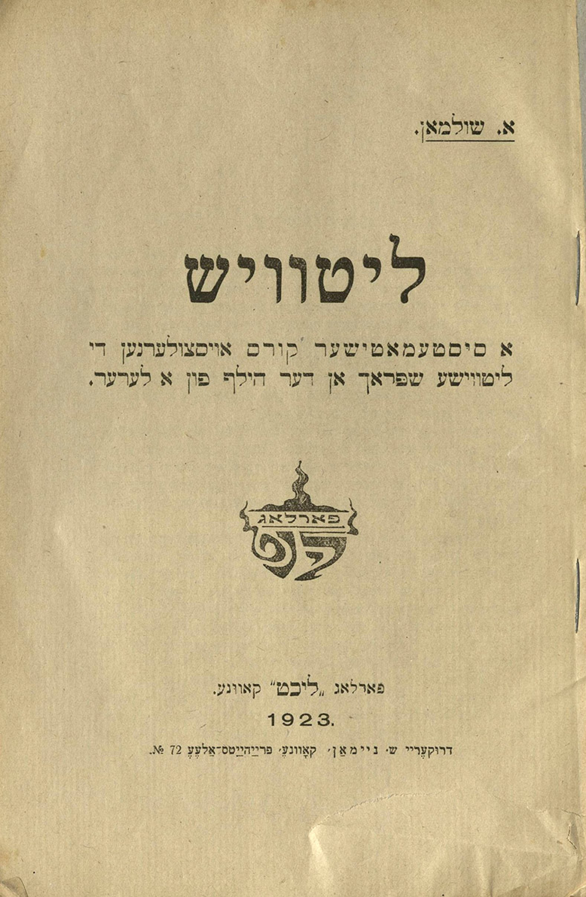 Cover of Litvish, a Yiddish textbook to learn the Lithuanian language by A. Shulman, Kaunas, Lithuania, 1923. YIVO Collection in the National Library of Lithuania.