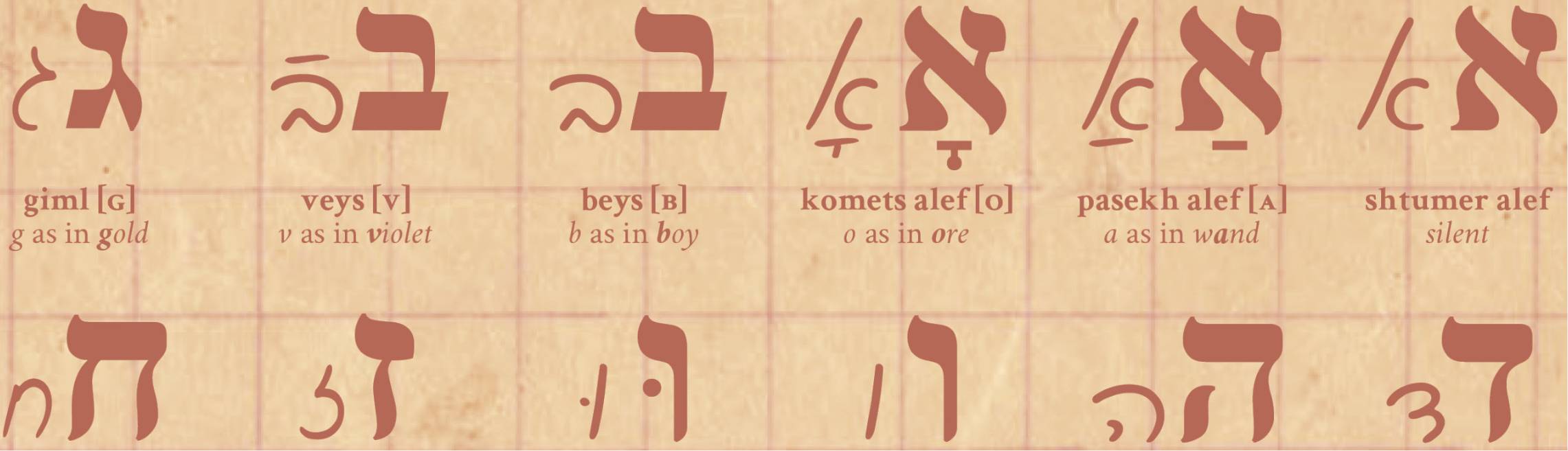 This four-session course will introduce students to the alefbeys, the alphabet used for reading and writing Yiddish. Yiddish uses the Hebrew alphabet, but with a system that is largely phonetic—unlike that of Hebrew. Reading and writing Yiddish require proficiency in the alphabet’s two forms: the printed and the hand-written. We will work on reading, writing, and pronunciation. While we will start from scratch, students are encouraged to browse this set of materials from the Yiddish Book Center prior to our first session.