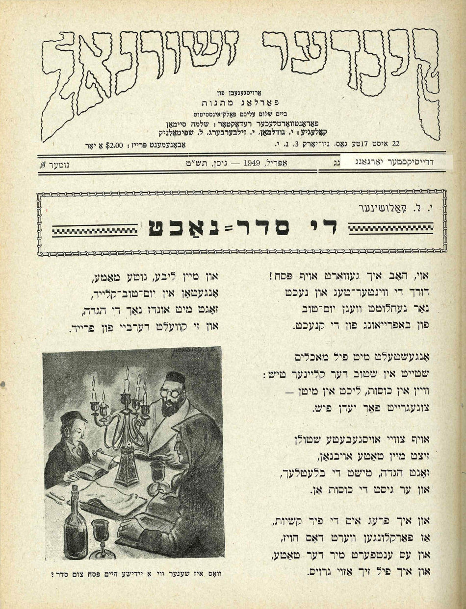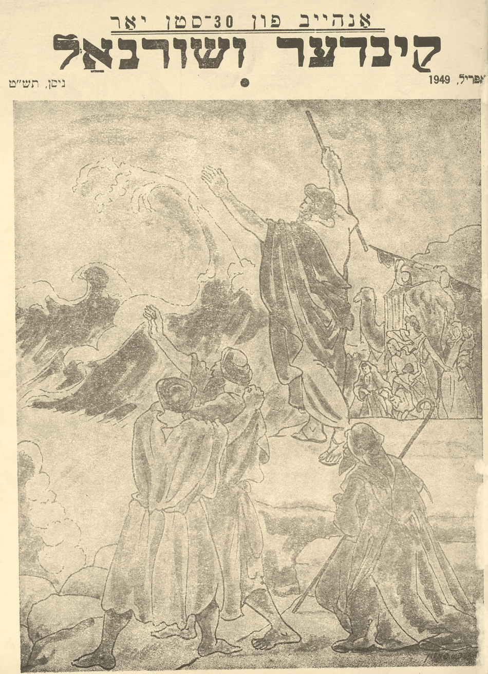 The theme of the April 1949 edition of Kinder zhurnal focused on Passover. On the cover is Moses splitting the red sea while the Jews observe the miracle. The first page has a poem written by Y. L. Kaloshiner about celebrating Passover from a child’s perspective. Next to the poem is a picture of a family reading their haggadot. The caption states, “What is more beautiful than a Jewish home on Passover with a seder?” referring to the ritual of the first two nights of Passover.