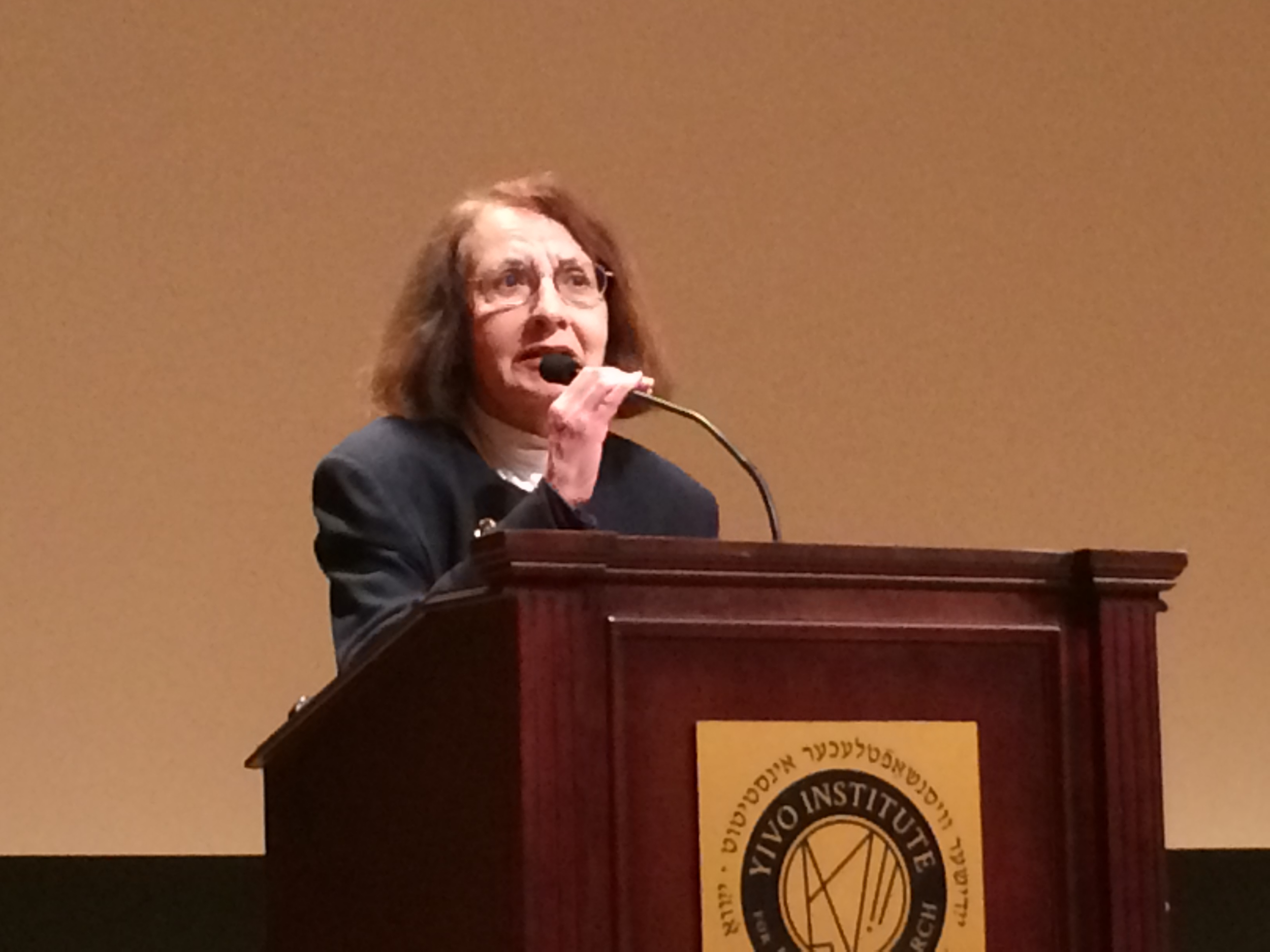 Estelle Guzik speaking at the world premiere of the documentary, No Asylum : The Untold Chapter of Anne Frank’s Story, at YIVO on October 11, 2015.