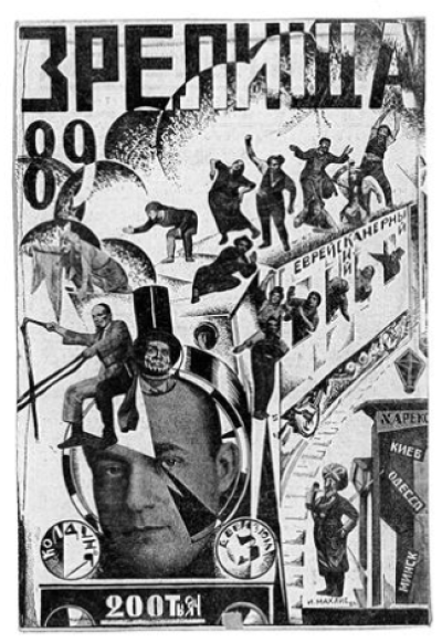 Zrelishscha (Entertainment), no. 89 (June 1924). The cover of this Moscow journal features a montage by I. Makhlis celebrating the GOSET (Moscow State Yiddish Theater), with Aleksandr Granovskii as the locomotive that pulls the train and actor Solomon Mikhoels as the conductor atop the engine. (YIVO Institute for Jewish Research)