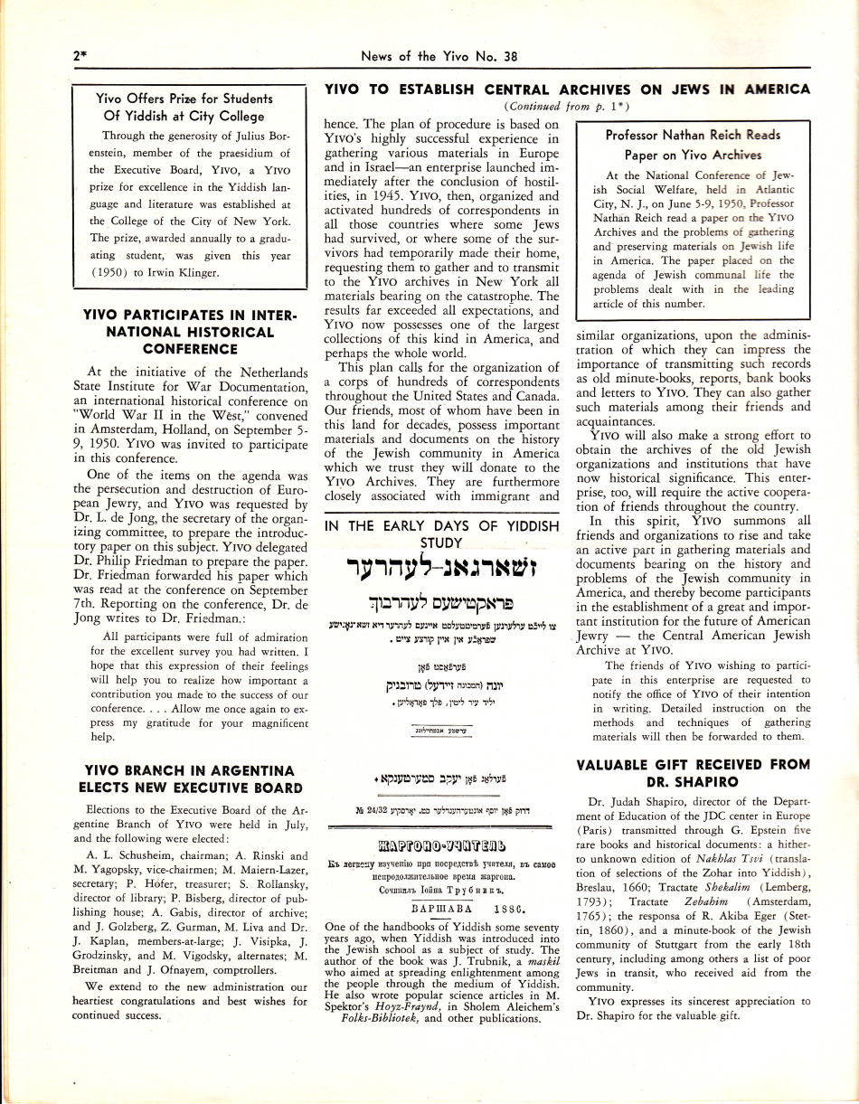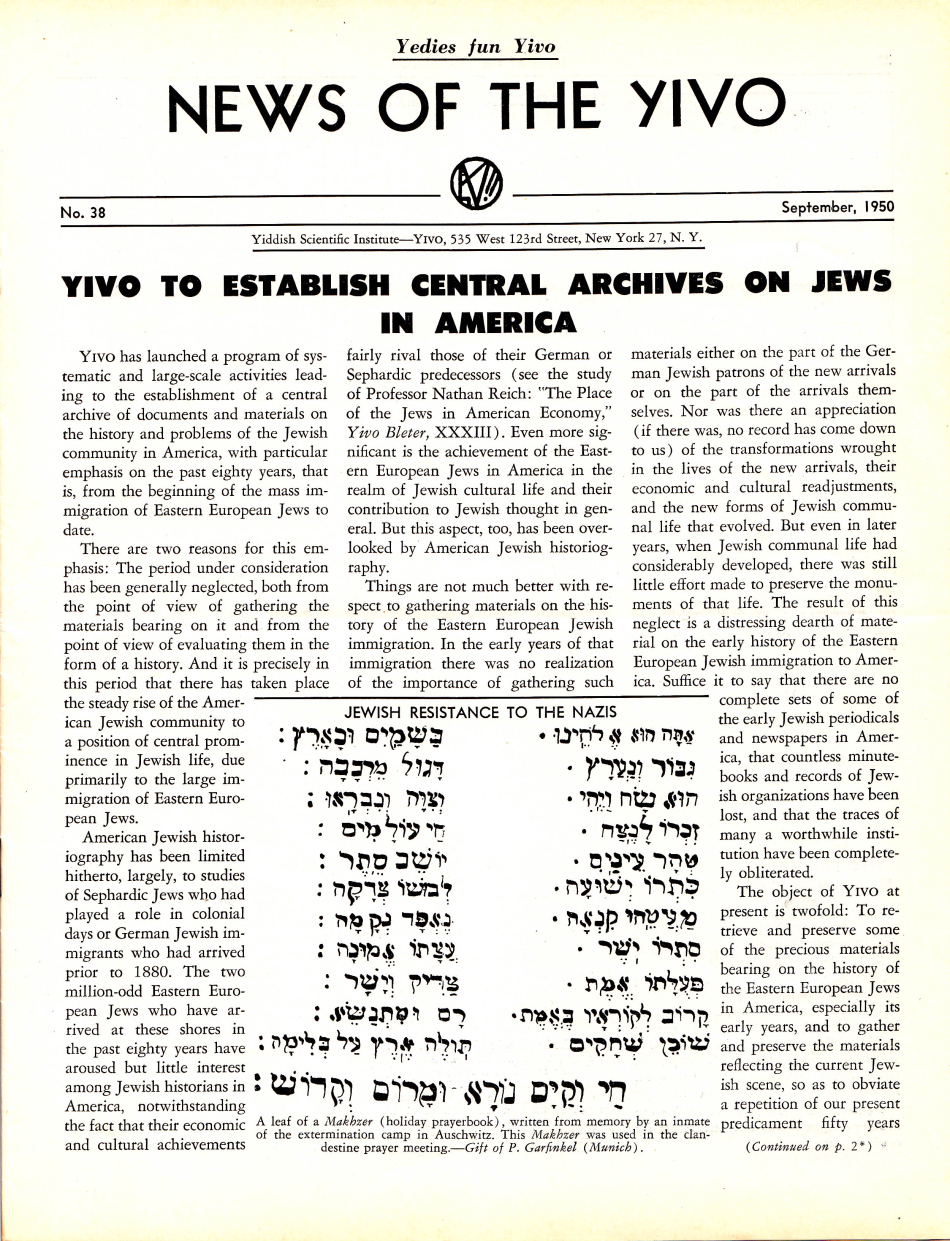 In September 1950, YIVO announced plans for a new, focused effort to collect artifacts, documents and other materials documenting American Jewish history, specifically the history of the mass immigration of Jews from Eastern Europe in the late nineteenth to early twentieth centuries and the impact that the immigrants were continuing to have on American Jewish life. This article in Yedies points to the surprising lack of documentation on these topics in Jewish archives of the day and expresses concern that much of American Jewish history was in danger of being lost.