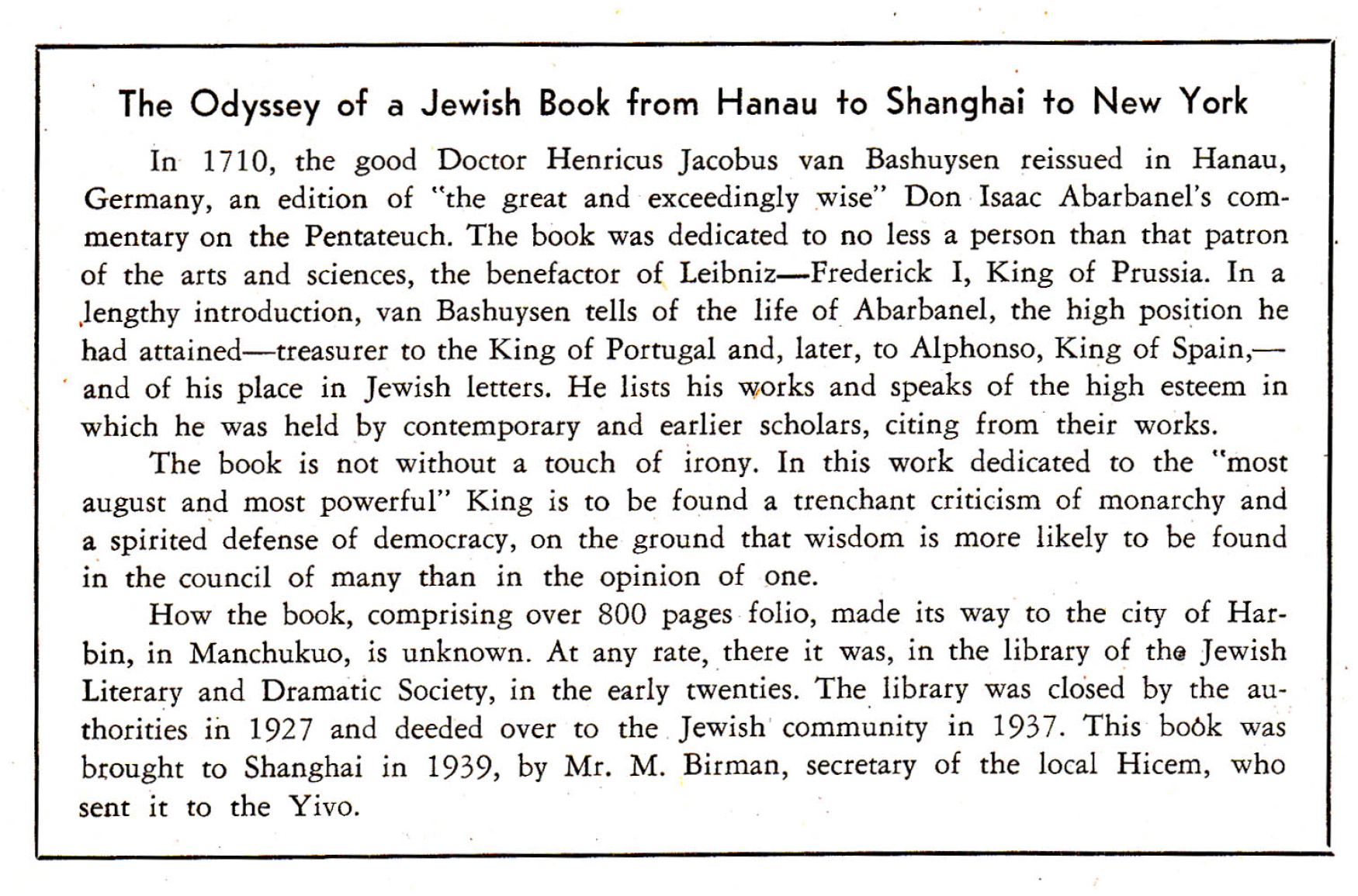 But other rare books in the YIVO Library have their own dramatic or mysterious trajectories. The April 1946 edition of Yedies highlights the story of one of them, a Torah commentary printed in 1710.