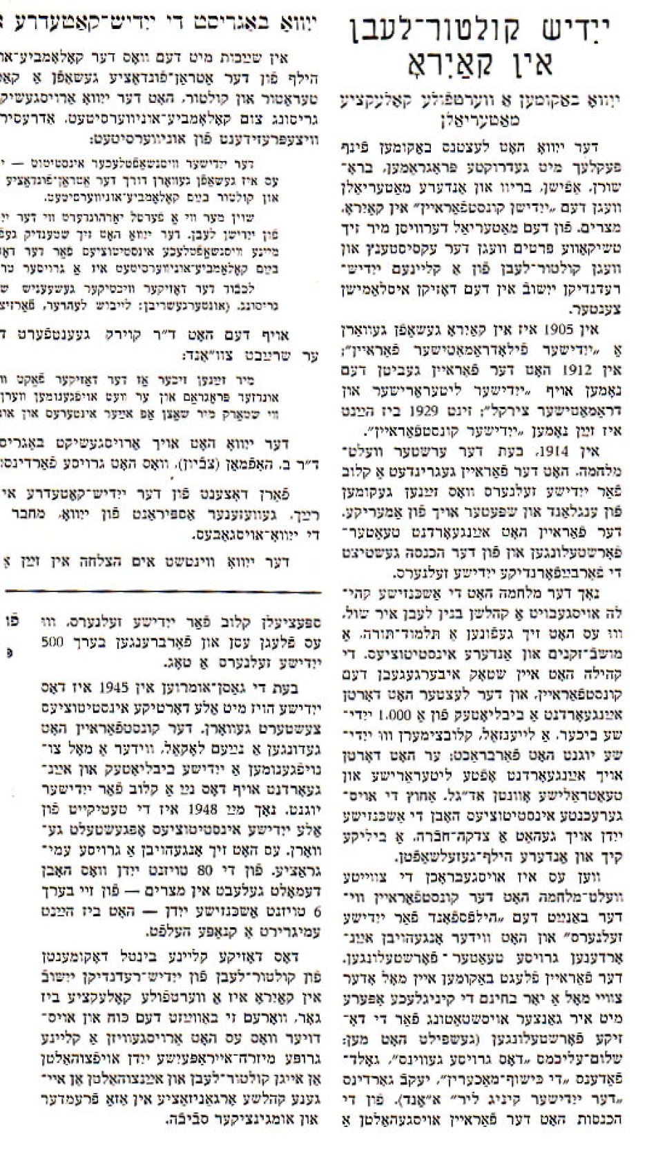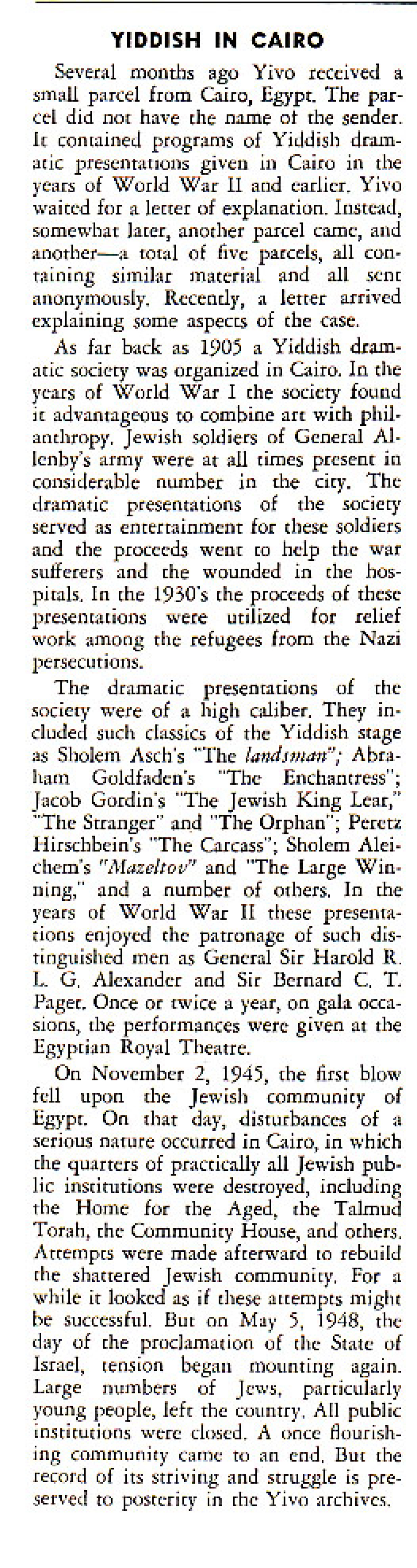 Recent memoirs, such as Lucette Lagnado’s The Man in the White Sharkskin Suit, have drawn some attention to the Egyptian Jewish experience. But few are aware that there was once also a Yiddish dimension to Jewish life in Egypt. The June 1952 issue of Yedies discusses the acquisition by the YIVO Archives of artifacts attesting to the existence of Yiddish theater in Cairo before World War II.