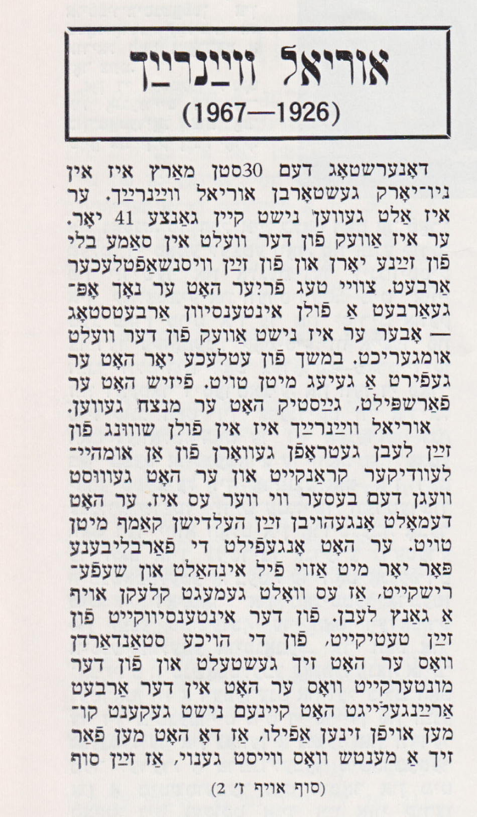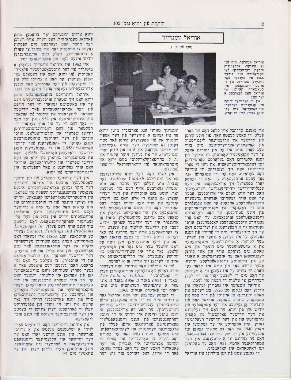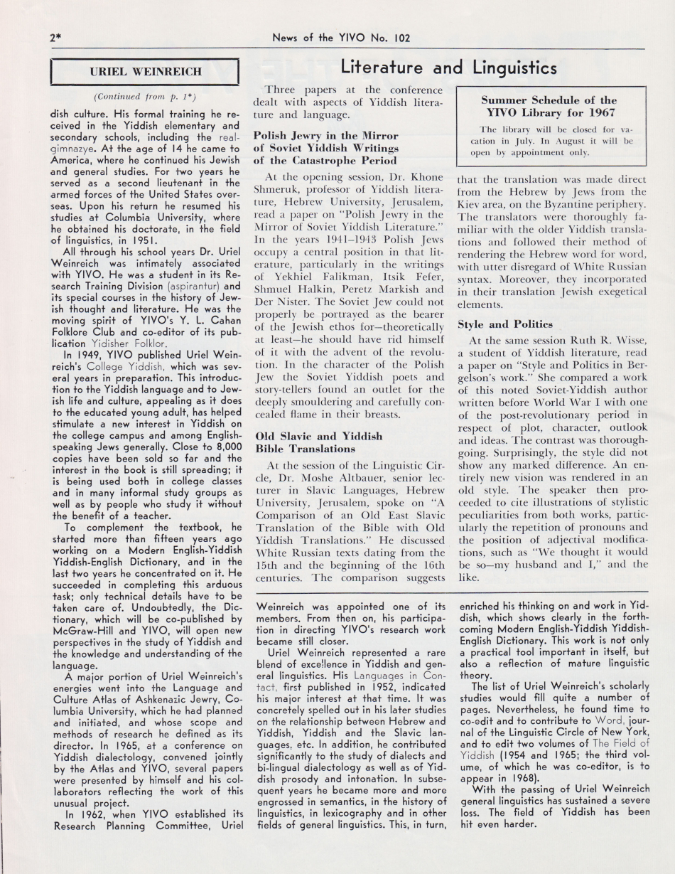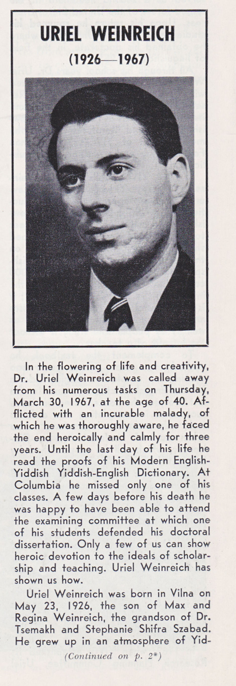The June 1967 issue of Yedies reported on the untimely death of Uriel Weinreich, noted linguist and lexicographer, in whose name YIVO established its intensive summer Yiddish immersion program. Forty-seven years later, his legacy continues in other ways, too: in the Yiddish-English English-Yiddish dictionary that saw publication a year after he died; in his textbook, College Yiddish, first published in 1949, and still in use today; and in a number of scholarly works on linguistics considered to be fundamental to the field as a whole, including Language in Contact, first published in 1953 and recently reissued in a new edition in 2011.