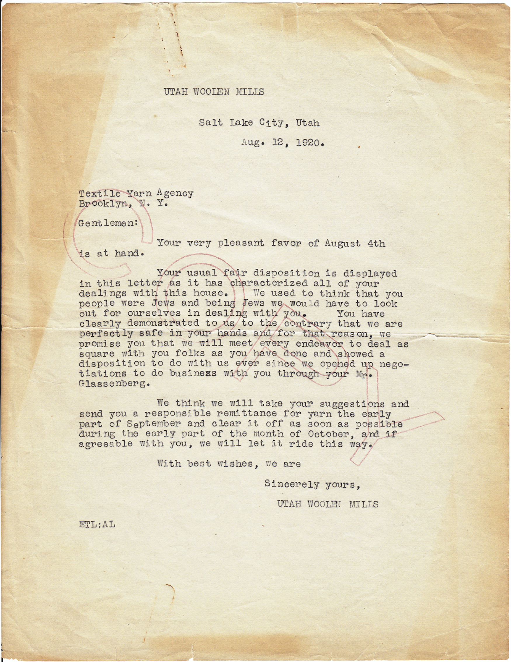 Martin Smolin has donated a copy of a letter his father, Jacob Smolin, proprietor of the Textile Yarn Agency, in Brooklyn, received from Utah Woolen Mills in 1920. As an artifact, the letter not only attests to the large presence of Jews in the garment trade, but also to the still tenuous position of Jews in American society. To people like Smolin’s customer in Utah, far from the large cities of the northeast that had the biggest Jewish populations, Jews were exotic others, but interpersonal contact sometimes resulted in a challenge to long-held stereotypes.